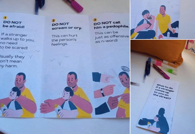 Притеснителната брошура е озаглавена: „Какво да правя, ако непознат дойде при мен на улицата?“ Следващите снимки насърчават децата да се доверяват на непознати и да не ги наричат „педофили“, тъй като думата можело да бъде „обидна“.