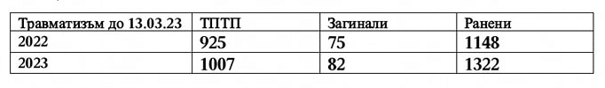 82 души са загинали при катастрофи от началото на годината, показва анализи на Института за пътна безопасност /ИПБ/, публикуван от председателя му Богдан Милчев във Facebook. Според данните това е ръст с 10% повече в сравнение със същия период на 2022 година. Тенденцията за увеличаване на жертвите, тежко ранените и броя тежки произшествия се запазва и през тази година.