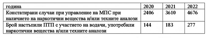 През изминалите 2 години МВР, ръководено от назначените от президента Румен Радев министри Бойко Рашков и Иван Демерджиев, регулярно анонсираше мерки за противодействие на пътнотранспортния травматизъм. Акцент беше поставян на засиления контрол при управлението на МПС след употреба на наркотици. При сравнителен анализ на данните за периода 2020-2022 година се констатира увеличение на ПТП след употреба на наркотични вещества с над 90% спрямо 2020 година, отбелязва Милчев.
