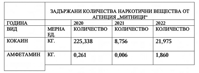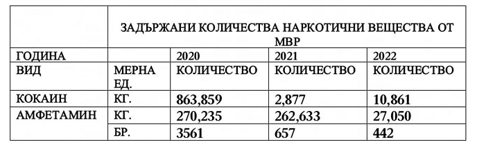 По реда на Закона за достъп до обществена информация /ЗДОИ/ ИПБ заяви и на 2 март получи от МВР данни за заловените количества кокаин и амфетамини за периода 2020-2022 година. Според предоставените данни през 2021 година заловеният кокаин е 2,8 кг при 863 кг през 2020 година. През 2022 година заловеният кокаин е едва 10,8 кг. При заловените амфетамини положението е същото. Данните показват, че през 2021-2022 година разкриването и залавянето на наркотици в България не е било сред приоритетите на МВР.