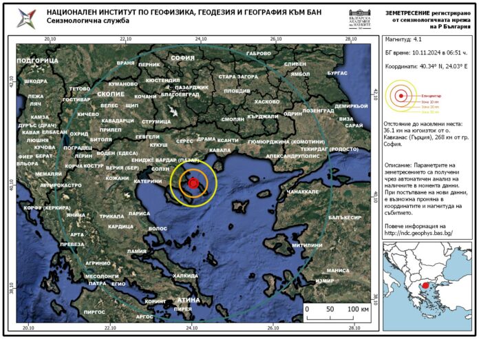 Земетресение с магнитуд М=4.1 е регистрирано в района на полуостров Халкидики. По данни на Националния сеизмологичен център към Национален институт по геофизика, геодезия и география – БАН, събитието от 10 ноември 2024 г., от 06:51 часа българско време е с епицентър на 140 км от град Петрич и на 270 км от град София.