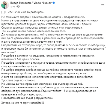 „Спортът зарежда, изморява, дисциплинира, учи, социализира. Той им дава много повече, отколкото би им взел. Да накараш един организъм, който спортува активно, да спре за дълго време или да се движи само онлайн, е равносилно да спреш да поливаш едно цвете и да го оставиш да вегетира. Резултатът е ясен. Спортистите са отговорни хора, те знаят да пазят себе си и своите съотборници и треньори може би много по-успешно отколкото голяма част от порасналите “ възрастни“.“