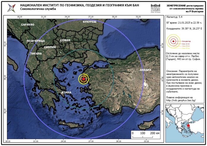 Земетресение с магнитуд М=5.4 е регистрирано в района на остров Лесбос, Гърция.
