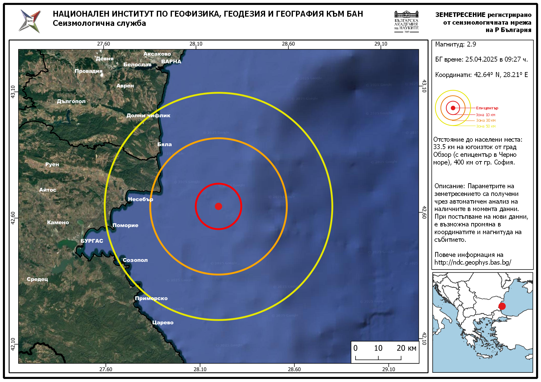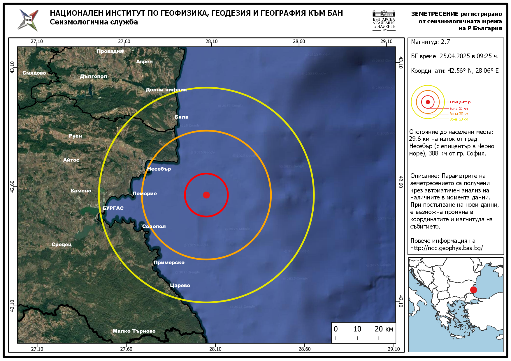 Припомняме, че в 09:17 часа стана земетресение със сила 3,2 по Рихтер с епицентър в Черно море, на 16,9 км на изток от Несебър