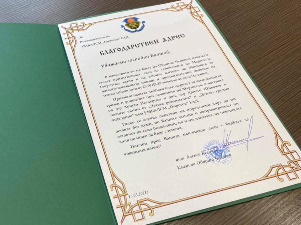 Спасяването на детето обединява жителите на Община Челопеч, които с тревога и надежда проследиха лечението й. За щастие медиците на „Пирогов“ успяха да й помогнат в битката с болестта и днес Маринела вече е добре. От името на градчето й кметът инж. Алекси Кесяков благодари на лекарите и лично на доктор Христо Пседерски, началник на Детска реанимация и доц. Христо Шивачев, началник на Клиниката по детска хирургия: