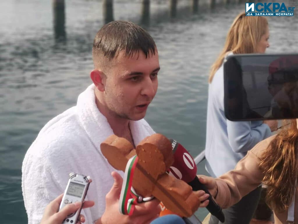 Бургазлията бе най-бърз в морската вода, която днес е с температура около 8-9 градуса, която по принцип се води сравнително топла за началото на месец януари. За екстремното усещане все пак допринесе и слънчевото време с висока температура на въздуха около 15 градуса, което направи скачането в студените води още по-трудно.