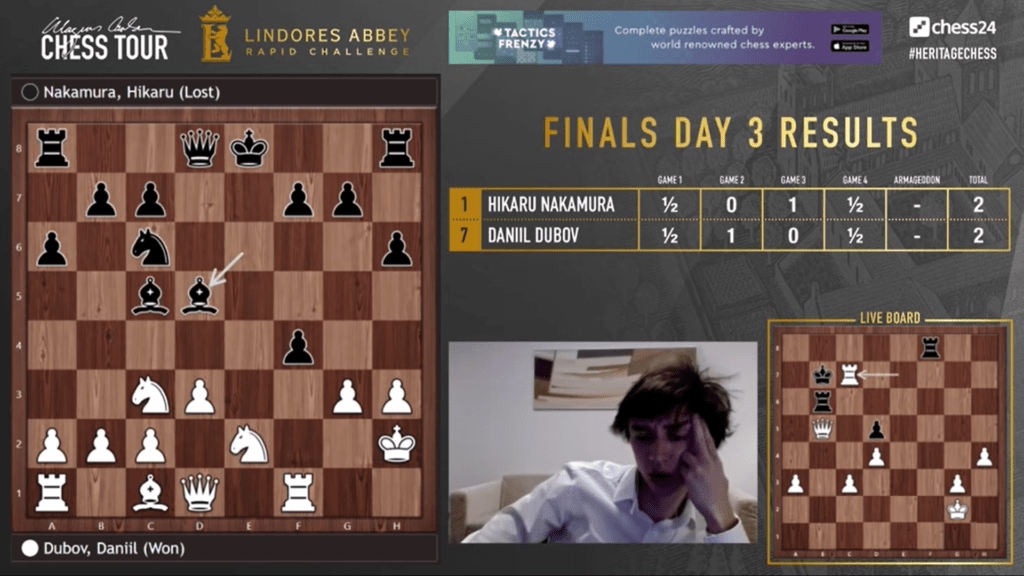 Обратът на финала дойде в края, с внезапната смъртоносна игра Армагедон. Накамура избра черни, разчитайки на бързата си техника, но Дубов имаше репертоар от нестандартни открития и използва рядката игра Виена (1 e4 d5 2 Nc3). Това проработи срещу американеца, който бе извън зоната си на комфорт, направи груба грешка отрано и загуби фигура.