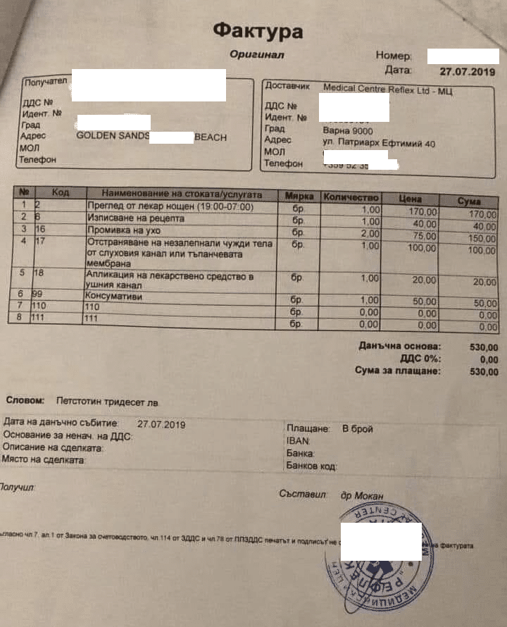 Фрапираща фактура, издадена за медицински преглед и промивка на ухо получи българин, който е гражданин и на ЮАР. В частен медицински център в к-с „Златни пясъци“ са взели сумата от 530 лева на 19-годишното момче, което потърсило помощ за болки в ухото.