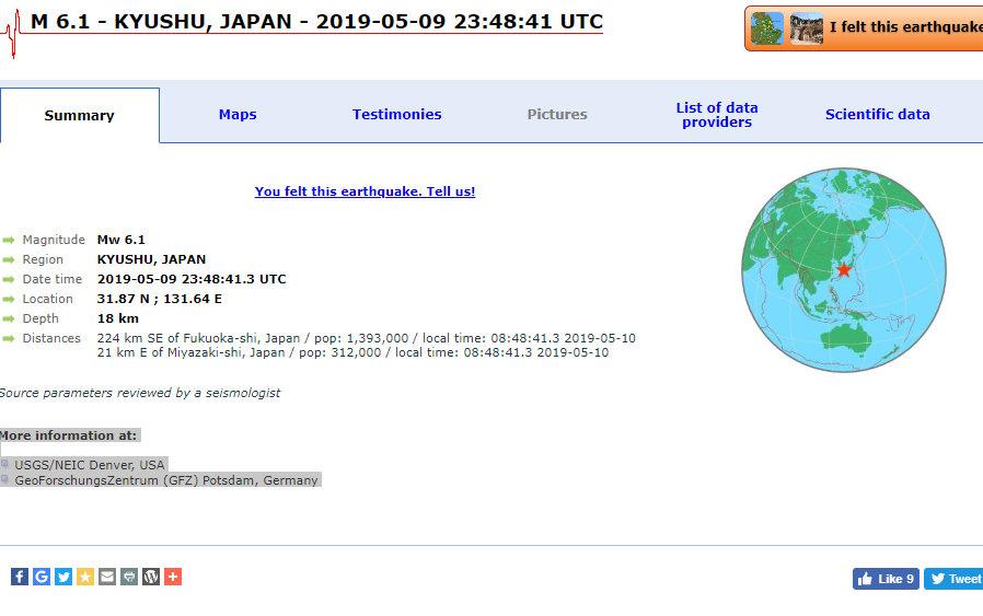 Земният трус е станал в 8:48 часа местно време. Епицентърът е бил край бреговете на перфектура Миядзаки, на дълбочина от 20 км.