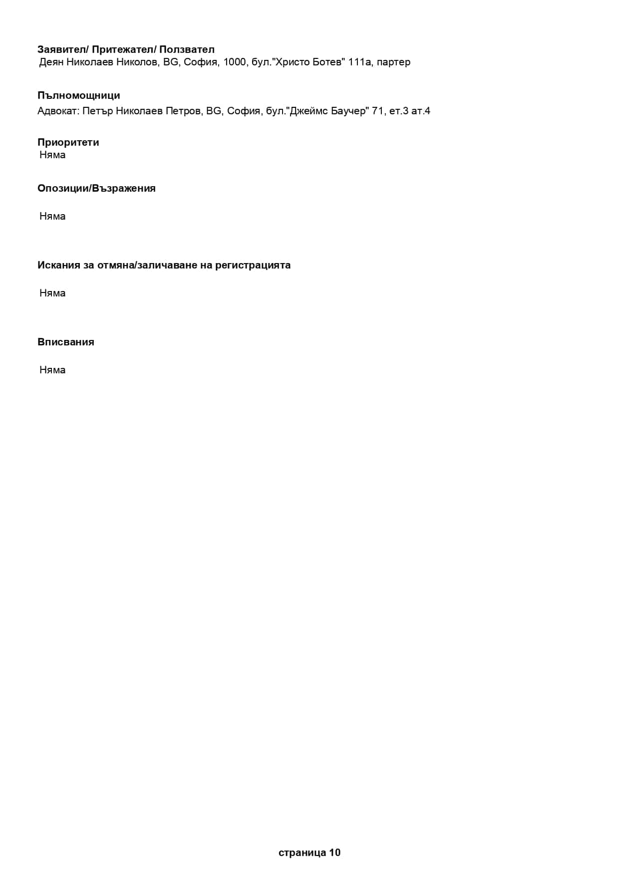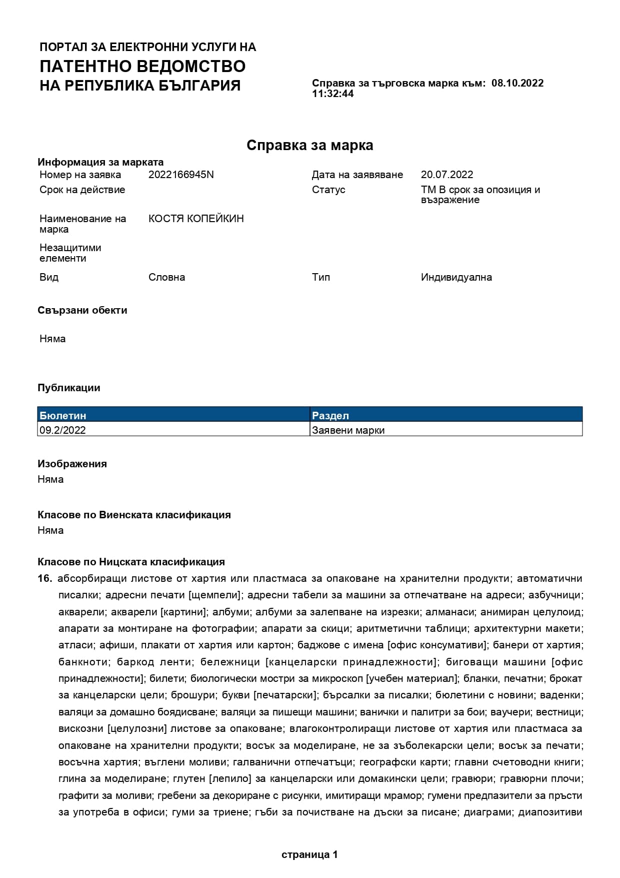 Представям ви данни от държавния регистър на търговските марки, воден от Патентно ведомство на Република България. Търговска марка „Костя Копейкин“ е заявена от Деян Николов, секретар на „Възраждане“-София, чрез адвокат Петър Петров – зам.-председател на партията. Марката е заявена за регистрация за стоки и услуги от класове 16, 25, 26, 35, 38, 41, 45.