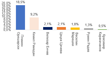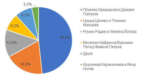 Пламен Орешарски и Данаил Папазов водят и по отношение на дела на потенциалните купени и контролирани гласове от общия брой гласове за кандидата с 18,5%. При класиралите се на втори тур кандидати за президент Цецка Цачева и Румен Радев делът на гласовете, подадени за тях в секциите в риск на първи тур съответства на съответно 2,1% и 1,3% от вота за тях.