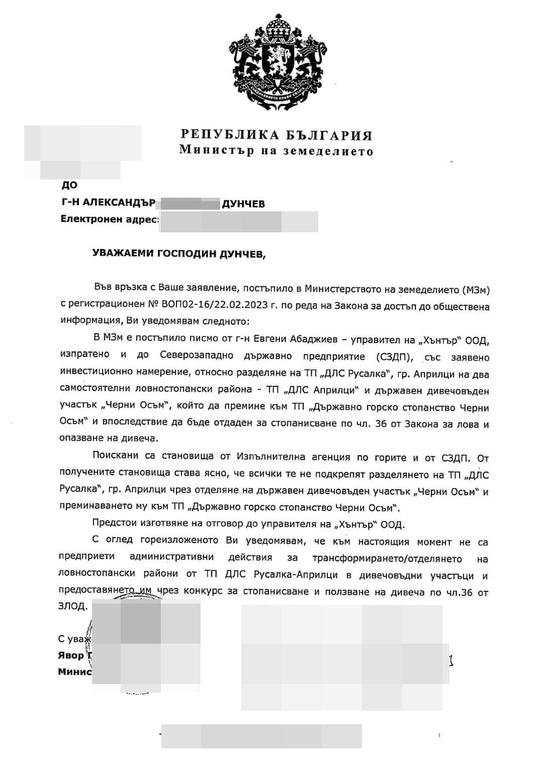 Бившият директор на ИАГ публикува и писмо, което е получил от служебния министър на земеделието Явор Гечев. В него се посочва, че по реда на Закона за достъп до обществена информация /ЗДОИ/ му съобщава, че в Министерството на земеделието е постъпило писмо от Евгени Абаджиев, който е управител на „Хънтър“ ООД. То е било до Северозападното държавно предприятие.