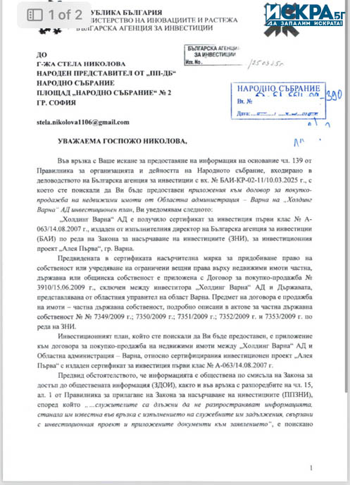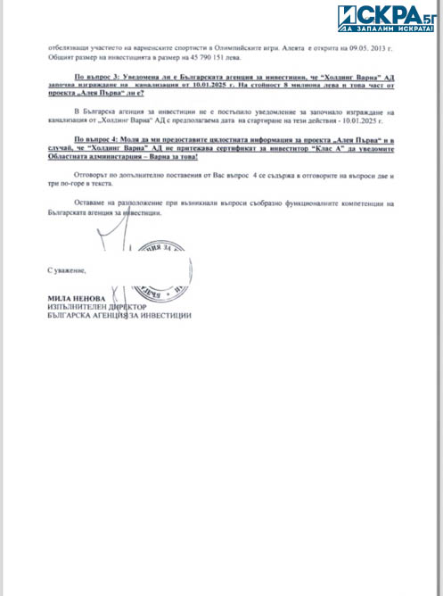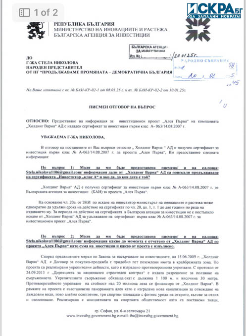 „При положение, че всички държавни институции, включително и Българска агенция по инвестиции отново ми отказаха да ми предоставят договора, но на мен вече ми го предоставиха „Зелено движение“ и аз го имам, ама те не знаят. Сега исках от тях информация да ми дадат инвестиционния проект, за да разбера в какъв срок е трябвало да бъде направена инвестицията за „Алея Първа“. И в много мил отговор от Българска агенция по инвестиции в последния възможен ден на срока ми отговориха, че нищо няма да ми предоставят като документи, но все пак ми отговарят, че по правилника на Закона за насърчаване на инвестициите, в инвестиционния план се включва график за изпълнение за срок от 3 години.