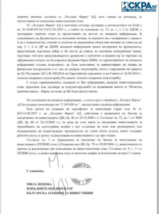 От БАИ пишат в отговор към Николова: „От „Холдинг Варна“ АД е постъпил отговор, входиран в деловодството на БАИ с вх. No БАИ-КР-10-114/21.03.2025 г., с който на основание чл. 37, ал. 1, т. 2 от ЗДОИ, е деклариран изричен отказ за предоставяне на достъп до исканата информация. В становището на Дружеството са изложени мотиви, че искането не е подкрепено с каквито и да е доказателства, сочещи за наличие на надделяващ обществен интерес по смисъла на пар. ,1 .т 6 от ДР на ЗДОИ; исканата информация засяга интересите на дружеството, представлява търговска тайна и би могла да доведе до нелоялна конкуренция между търговци; тъй като представляваното дружество е публично и акциите му се тьргуват на официалния сегмент на Българската фондова борса /БФБ/, то предоставянето на исканата информация създава възможност да бъде използвана за манипулиране на пазара на финансови инструменти и от там до пазарна злоупотреба, което е нарушение на правото на ЕС-Регламент (ЕС) No 596/2014 на Европейския парламент и на Съвета от 16.04.2014 г. относно пазарната злоупотреба (Регламент относно пазарната злоупотреба).