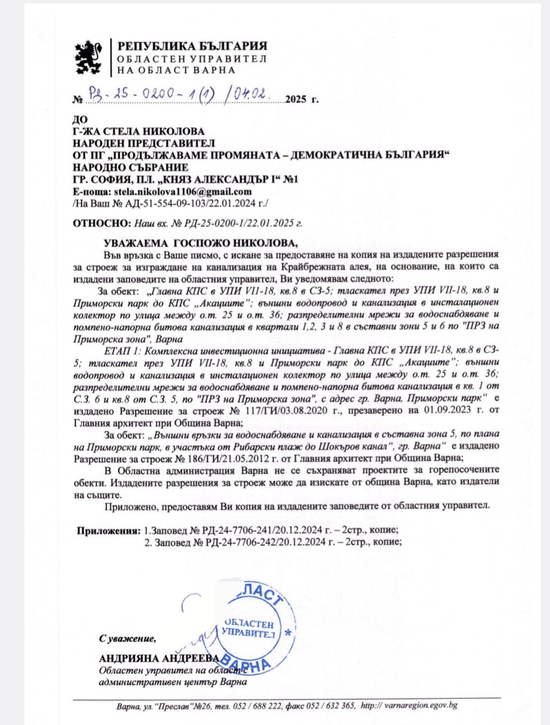 „Поисках да ми бъдат предоставени копия на разрешенията за строеж и проектите на база, на които са издадени заповедите на областния управител за стартиране на проекта на „Холдинг Варна“ на Крайбрежната алея. От Областна администрация ми изпратиха двете заповеди на областния управител, които не съм искала и са на сайта на Областна администрация. Продължавам да търся проекта, по който в момента се строи на Крайбрежната алея. Информираха ме, че в Община Варна няма такъв. Отново ще пусна искане за предоставяне на информация до Областна администрация.“