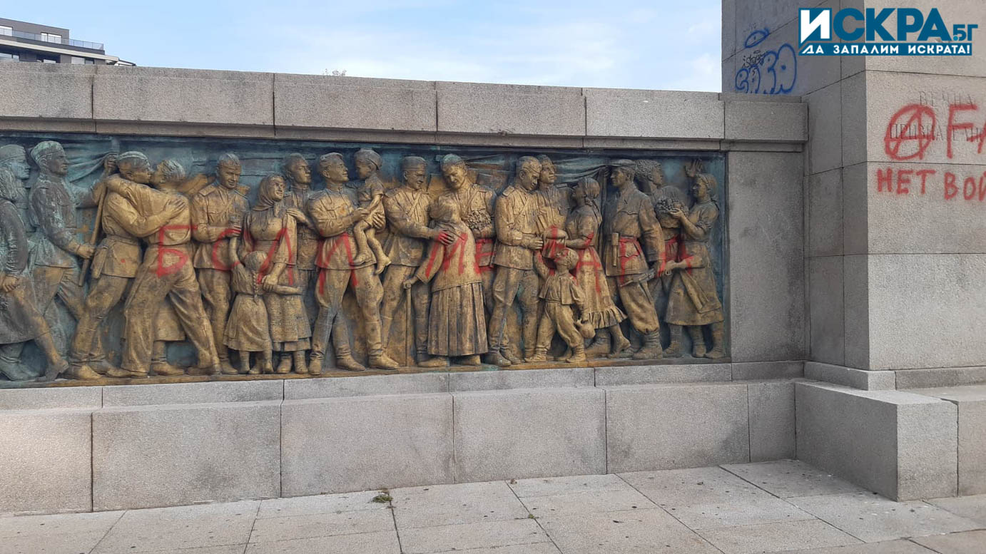Червени надписи, които призовават да се спре войната в Украйна, могат да се прочетат както отстрани монумента, така и по войниците. Един от тях гласи: