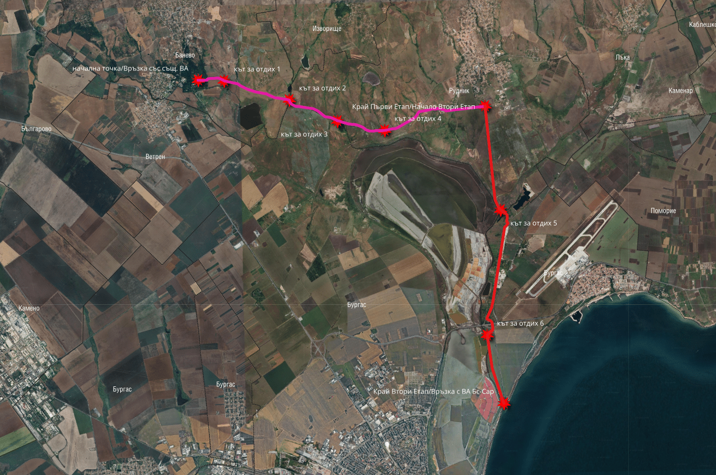 Трасето ще бъде разделено на два етапа от по 8 километра, на които ще има обособени зони за отдих. То ще минава през Зоопарк Бургас и Бургаските солници, като ще стига до новия квартал „Кюшето“, където ще се включва в съществуващата велоалея, отвеждаща до Морската градина и квартал „Сарафово“. Част от алеята върви успоредно и с неизползваема железопътна линия, която в бъдеще също може да бъде развита.