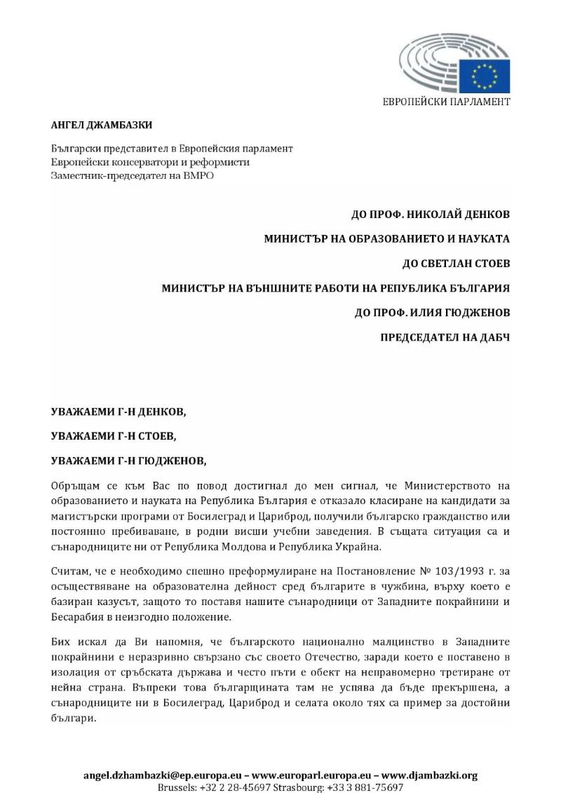 Българският представител в Европейския парламент и заместник-председател на ВМРО Ангел Джамбазки сигнализира Министерството на образованието и науката, Министерство на външните работи и Държавната агенция за българите в чужбина във връзка със сигнал за дискриминация към наши сънародници от Босилеград, Цариброд, Република Молдова и Република Украйна.