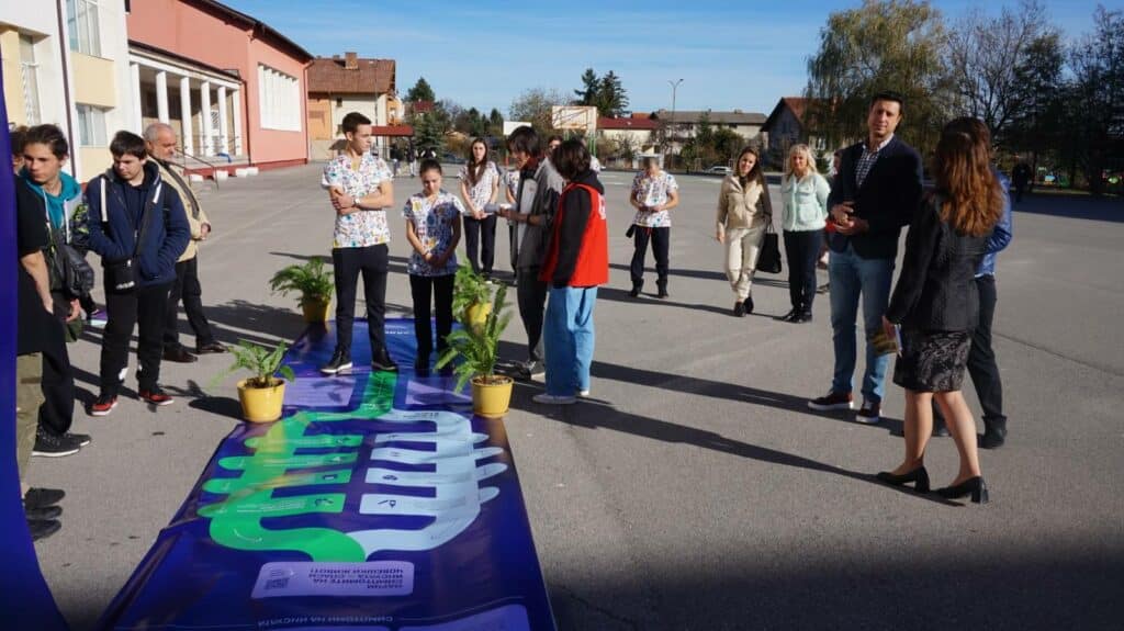 Доброволци на Български червен кръст символично преведоха по пътеката ученици от 9 до 11 клас на училището, за да им помогнат при разпознаването на симптомите на инсулта.