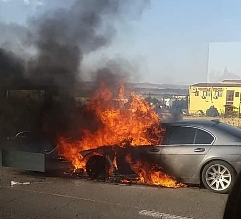 По непотвърдена информация лекият автомобил е пламнал в движение. Няма пострадали, но материалните щети са сериозни.