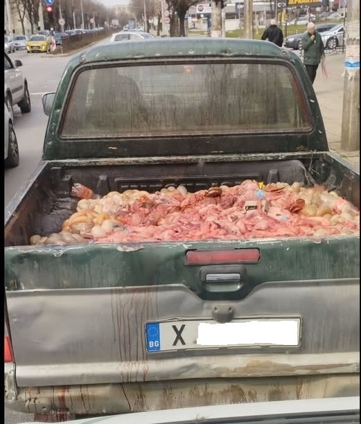 При проверката водачът заявил, че открил вътрешностите „на поляна край пътя“ и ги натоварил, за да нахрани своите пет кучета. Произходът на продуктите обаче е напълно неизвестен — не е ясно дали са от здрави или болни животни, което представлява сериозен риск за здравето. Превозът е извършен в пълно нарушение на хигиенните и ветеринарномедицинските изисквания, а срещу шофьора ще бъде наложена санкция.
