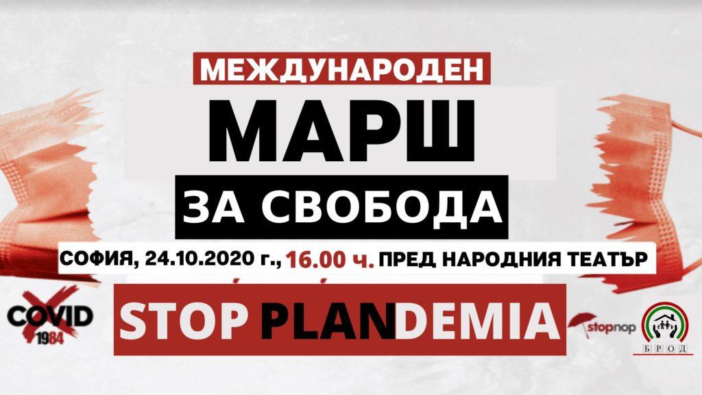 България се присъединява към Международния марш срещу COVID мерките, организиран в Полша. Това съобщиха от „Българския Род Обединен за Децата“ в социалната мрежа Facebook. Събитието у нас ще започне в 16:00 часа на 24 октомври пред Народния театър в София.