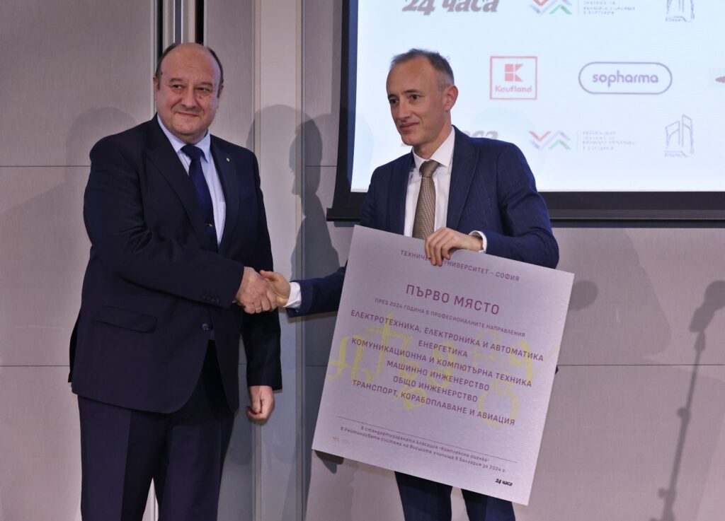 Отличието прие ректорът на Техническия университет в София проф. Иван Кралов. През миналата година университетът заема първо място в обучението по шест професионални направления във важни за икономиката технически специалности.