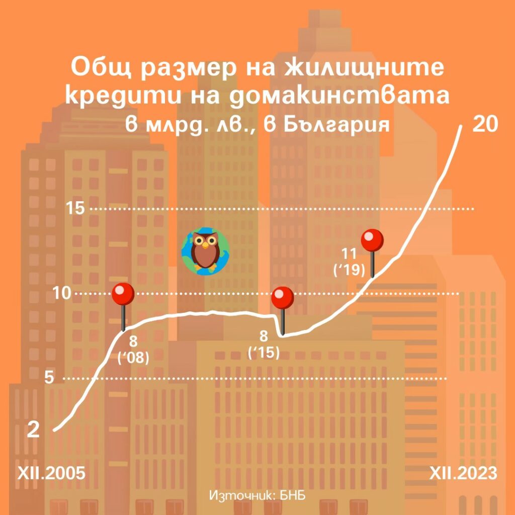 „Към края на 2023 българските домакинства дължат общо 20 млрд. лв. по различни жилищни кредити. Те са разпределени на около 200 хил. домакинства със средна стойност от около 100 хил. лв. Отделните суми могат да варират по размер или срок за изплащане.