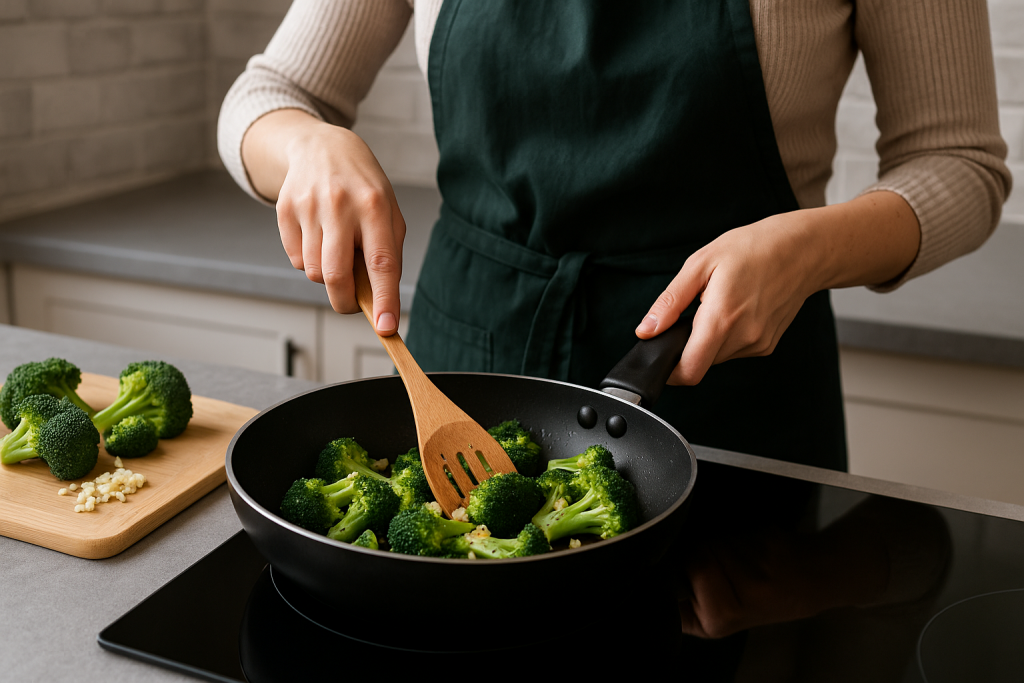 Сложете броколите в тигана. Разбърквайте често в продължение на 4-5 минути. Търсете лек златист загар по краищата – това добавя вкус и текстура.