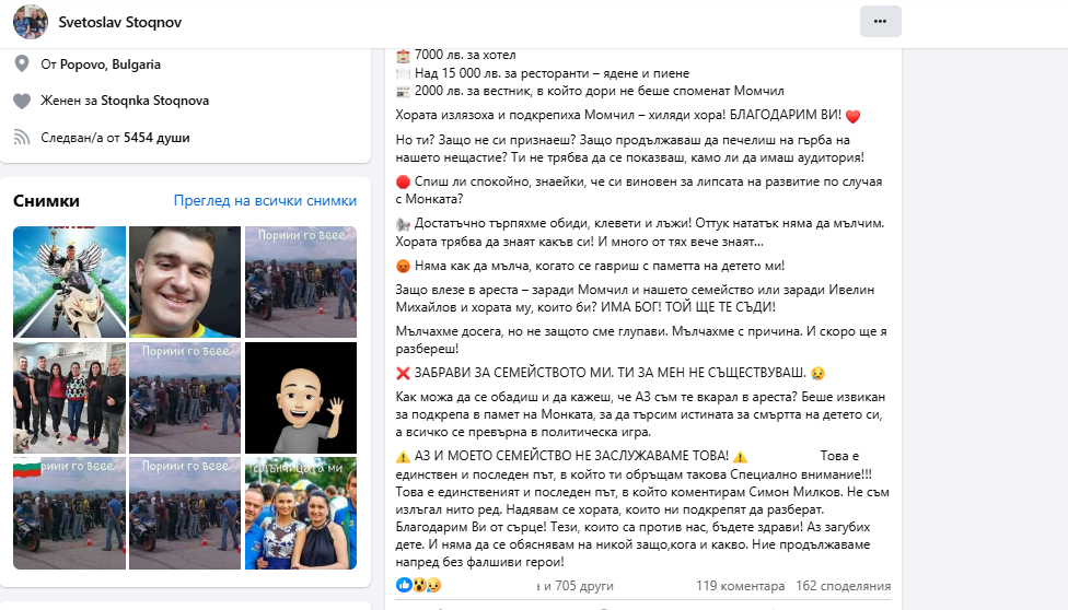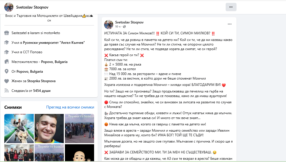 „Как кой е Симон Милков? Та нали ти и семейството ти го молихте да дойде в Попово? Или си забравил? Как ти се събраха всички тия думи, тия лъжи в устата да оклеветиш човека, който се подложи и на студ, и на тормоз, и на хули заради теб? Кой написа този пост, защото ти не си способен да го напишеш и подредиш така, та ти на твоите постове и точка не слагаш на едвам трите изречения, които пускаш, та камо ли да напишеш този ферман. Кой го написа бе Светльо? Как не те беше срам да застанеш пред съда в Попово, да чакаш Симо да излезе, че да го прегърнеш? Ти си ЮДА !!!!! Я кажи дали си взел пари от някой? Колко струва отровата, която избълва? Сега вече всичко ще се разбере. Ти само се оправдаваш, но истината ще излезе поне така каза Симон Милков. Тя няма да е добра за теб обаче! Жалко за Момчил, че е имал такъв баща, и още по-жалко за Симо, че си даде сърцето и месеци от живота си заради теб, заради твоя син. Как ще живееш от сега нататък? Ще спиш ли спокойно?“