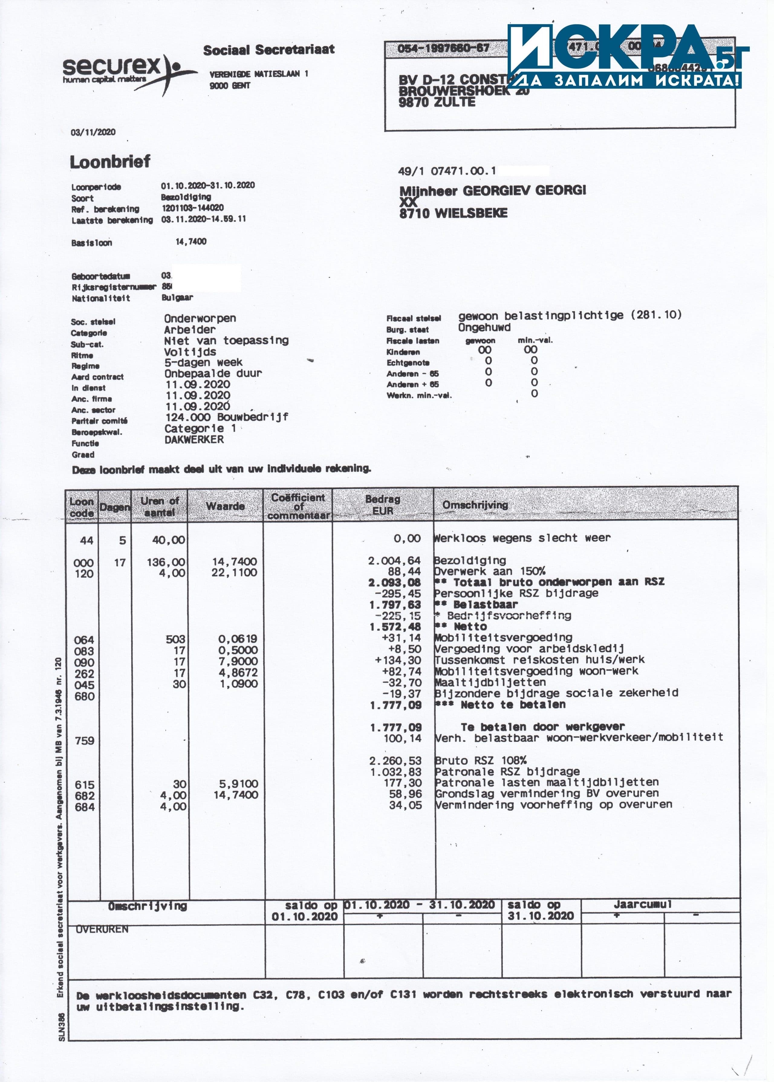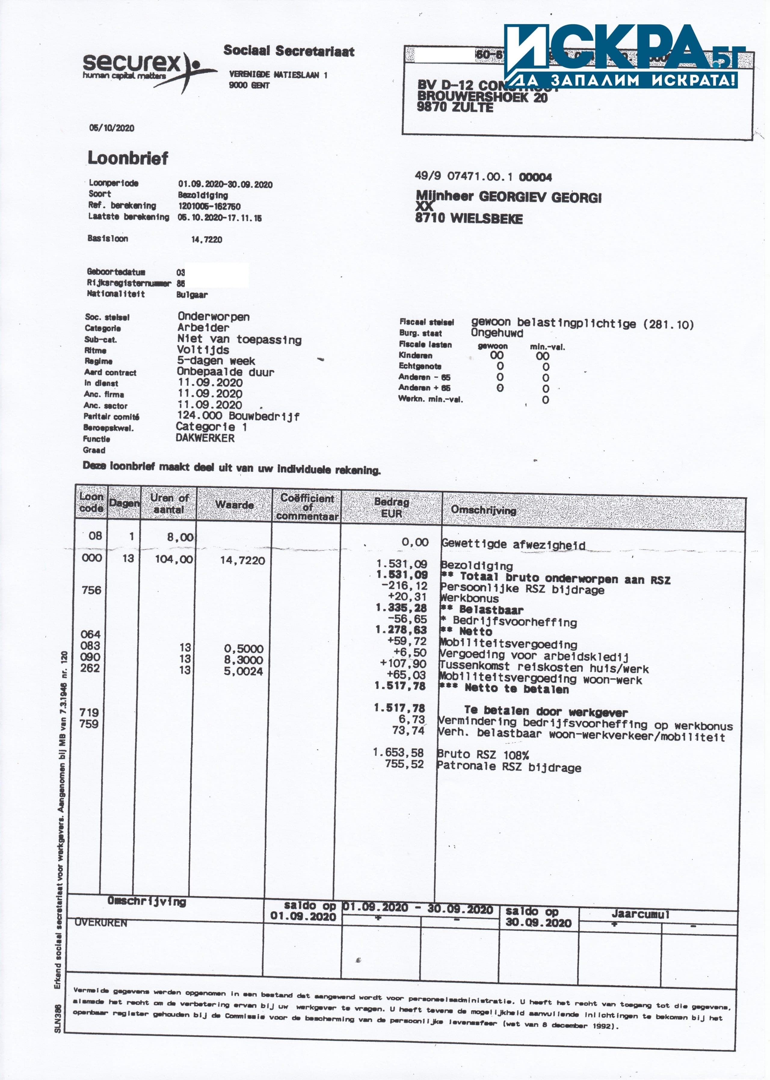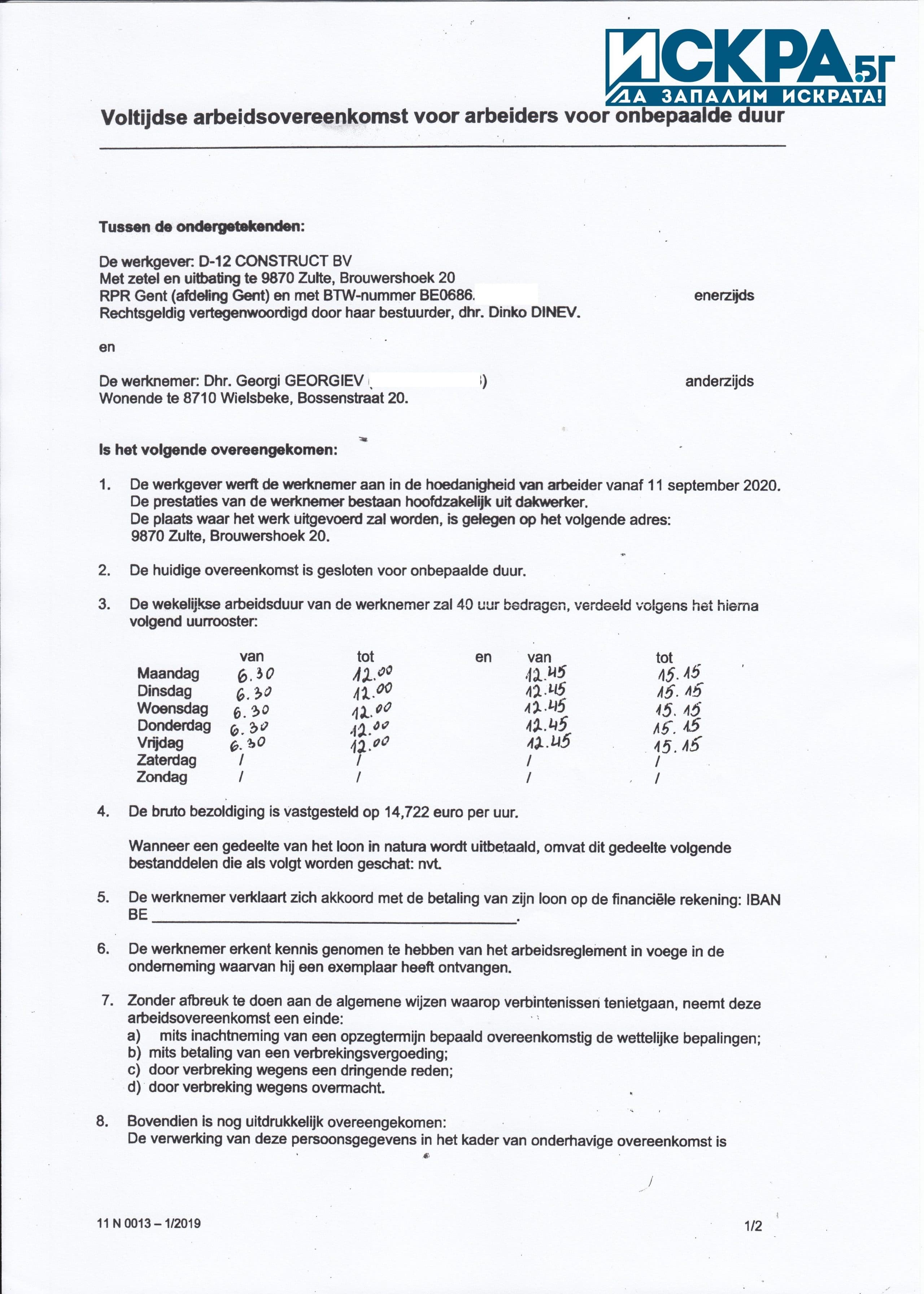 Белгийската фирма D-12 Construct е основана и регистрирана от двама българи. Според дейността й тя се занимава предимно с хидроизолация, покриви и генерира не лош приход. Доскоро Георги Георгиев, родом от Ямбол, е бил неин служител в Белгия. Той обаче разказа пред журналист на Искра.бг, че е бил експлоатиран, работодателите му са принуждавали служителите си да плащат фирмени данъци и са ги карали да заблуждават полицията.