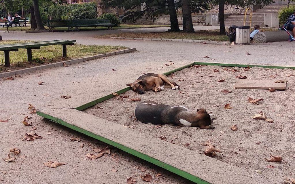 Бездомни кучета обикалят по детските площадки в Стара Загора, сигнализираха във „Фейсбук“ жители на града. В социалната мрежа бе разпространена снимка, на която се вижда как две безпризорни животни спят на пясъчника, където си играят малчуганите.