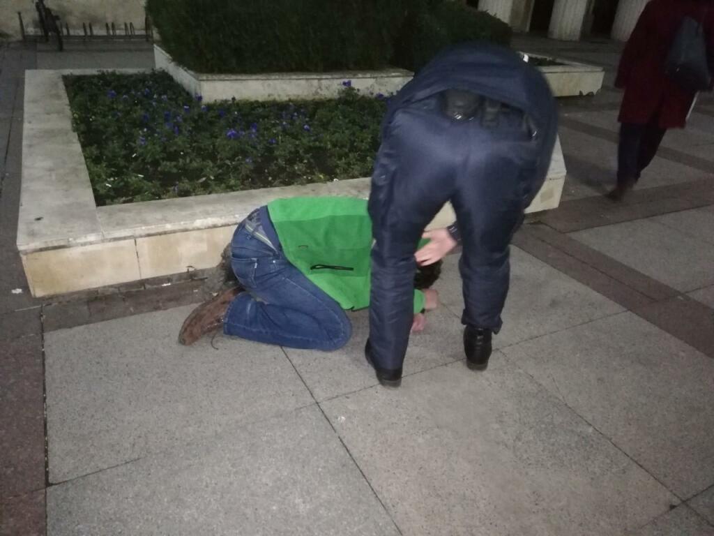 Преди броени минути гражданин минава пред сградата на Община Бургас. На пътя вижда паднал човек, който не е контактен. Гражданинът подава сигнал на 112 и се опитва да помогне на човека. От общината излиза полицай, който също прави опити да помогне на падналия, но без успех.