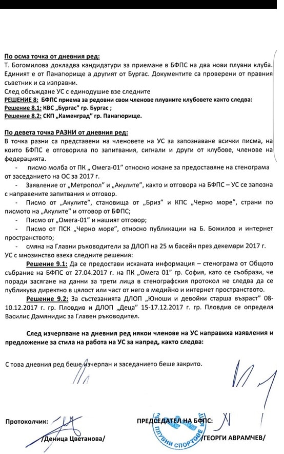 „Събранието на ръководния съвет на Плувната федерация не можа да се състои миналия вторник, защото не можахме да съберем кворум. Отделно получихме и някакви допълнителни жалби и ще го оставим за края на август. Аз съм сезирал Правната и Етичната комисия, защото се получиха вече няколко сигнала. Те също ще трябва да разгледат казуса и ще вземем решение. Всички документи до този момент съм предоставил на Комисията, за да разгледа случаите и да излезем със становище. Състезателите, които са били установени с нарушение ще бъдат дисквалифицирани. Какво решение ще се вземе за клуба пак ви казвам, не мога да ви кажа, защото изчаквам решението на управителния съвет“, категоричен е Аврамчев.
