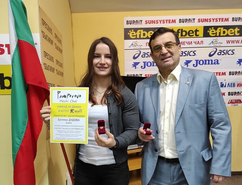 Станах първа в света, но има какво още да покажа, заяви шампионката Биляна Дудова. Това се случи при избора за спортист на октомври в традиционната анкета на пресклуб „България“, като е получила доверието на всичките 23 медии във вота. Нейният личен наставник Георги Калчев е бил избран за треньор на октомври. Тя коментира, цитирана от Българската федерация по борба:
