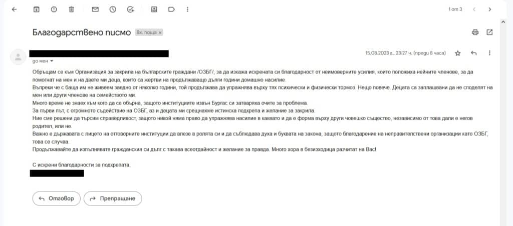 „Обръщам се към Организация за закрила на българските граждани /ОЗБГ/, за да изкажа искрената си благодарност от неимоверните усилия, които положиха нейните членове, за да помогнат на мен и на двете ми деца, които са жертви на продължаващо дълги години домашно насилие.