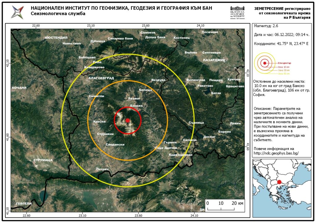 Земетресение с магнитуд 2,6 по Рихтер е било регистрирано в района на град Банско, област Благоевград.