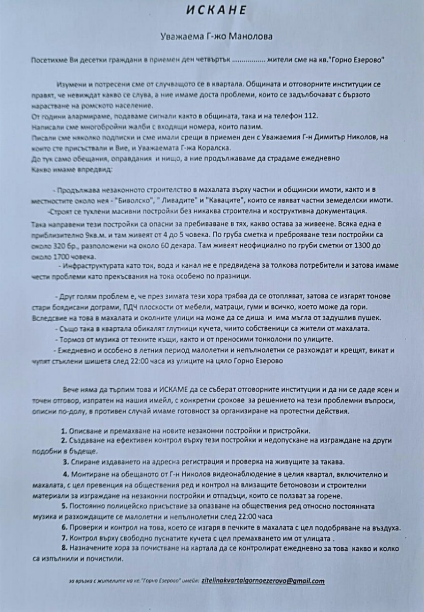 След като предишни срещи с кмета Димитър Николов не дават никакъв резултат, сега е внесено искане от десетки жители на „Горно Езерово“ до директора на ЦАУ „Възраждане“ Магдалена Манолова, в чийто териториален обхват попада кварталът. В документа хората описват картина на трайно беззаконие, което според тях се развива с мълчаливото съучастие на местната власт и пълното бездействие на отговорните институции.