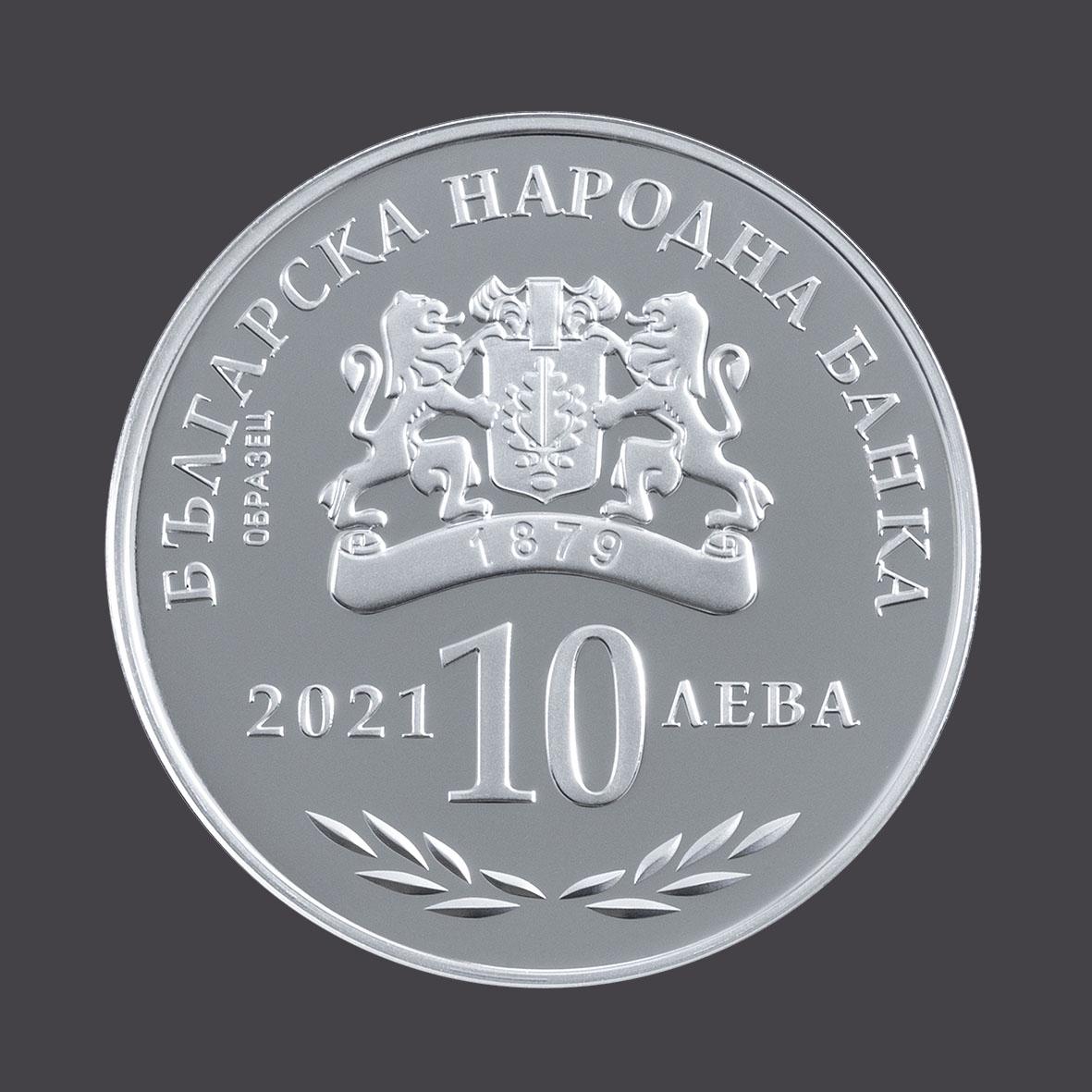 На лицето на монетата в полукръг горе има надпис „Българска народна банка“, а отдолу е изписана 2021 – годината на емисията и номиналната й стойност „10 лева“. Под тях има венец от стилизирани лаврови клонки. На гърба на монетата в средата има петолиние с ключ сол, който изобразява птица и вляво от него надпис „100 години“. Има и надпис „Национална музикална академия“ с 2 стилизирани лаврови клонки.