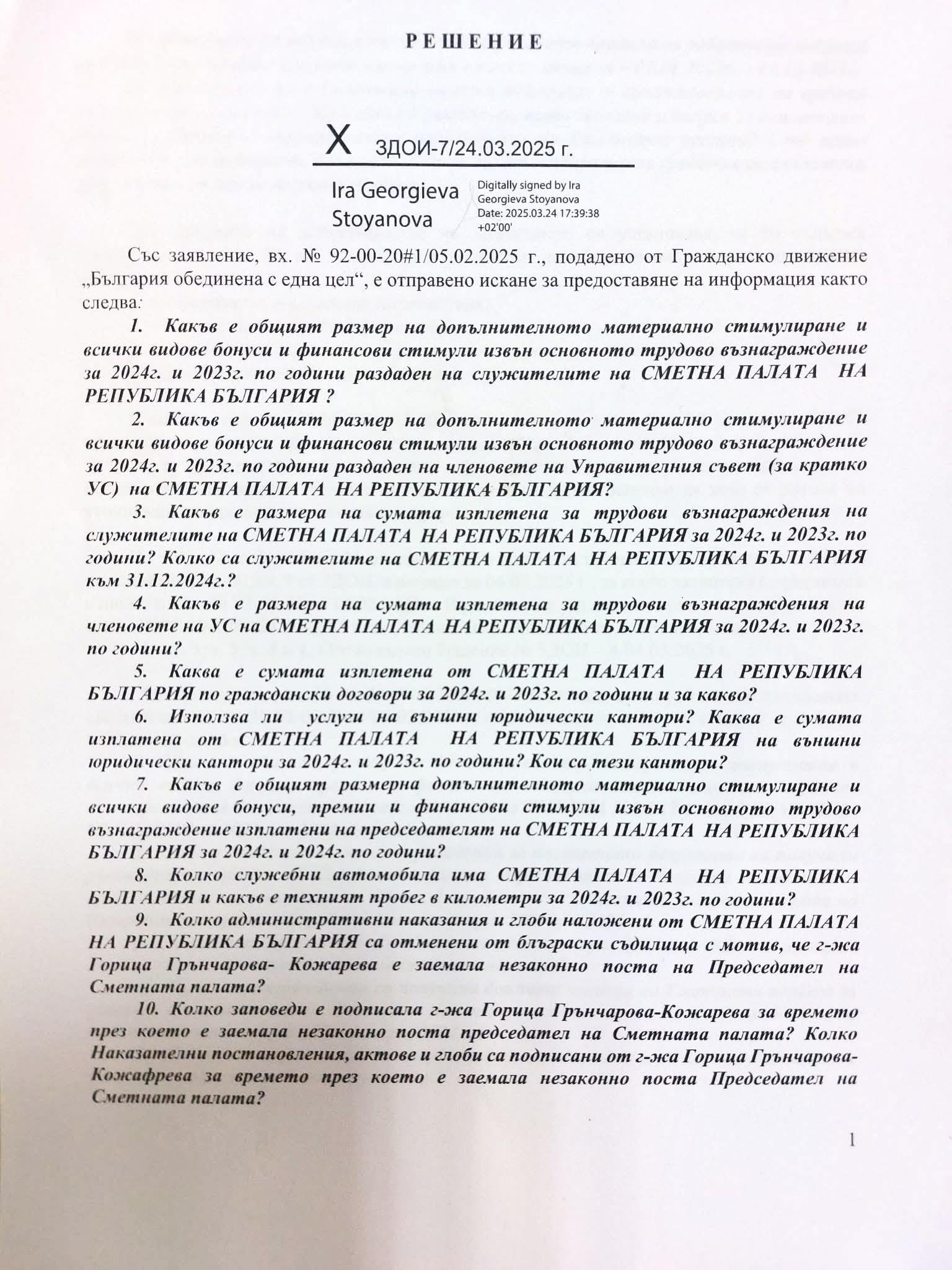 Председателят на Сметната палата си е дала сама на себе си за 2024 г. 102 000 лв. бонуси, като награда за „постигнати резултати“, твърдят от БОЕЦ, публикувайки документи:
