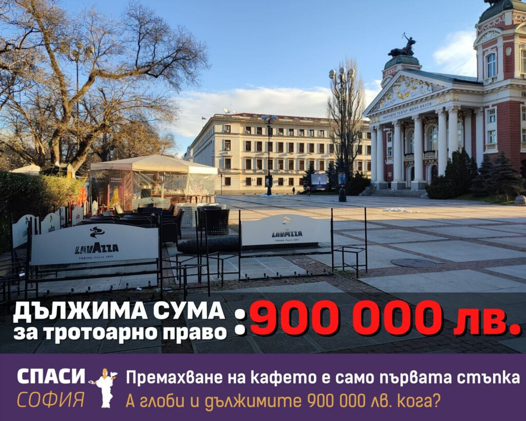 Премахването на незаконното кафе пред Народния театър е добра новина, която показва колко неработещи са контролните институции. Това коментира един от основателите на „Спаси София“ Борис Бонев във Facebook. Той изтъква, че на най-централната локация, 10 години, някой заема двойно по-голяма от разрешената площ и работи целогодишно вместо сезонно. Според него дължимата сума, само за допълнителната заета площ, е 900 000 лева. Огромни средства, които никой не знае дали са платени или изискани. По този казус Бонев е изпратил запитване до Фандъкова и чака отговор. По думите му тук идва въпросът за отговорността на натоварените с правомощия институции, а именно: