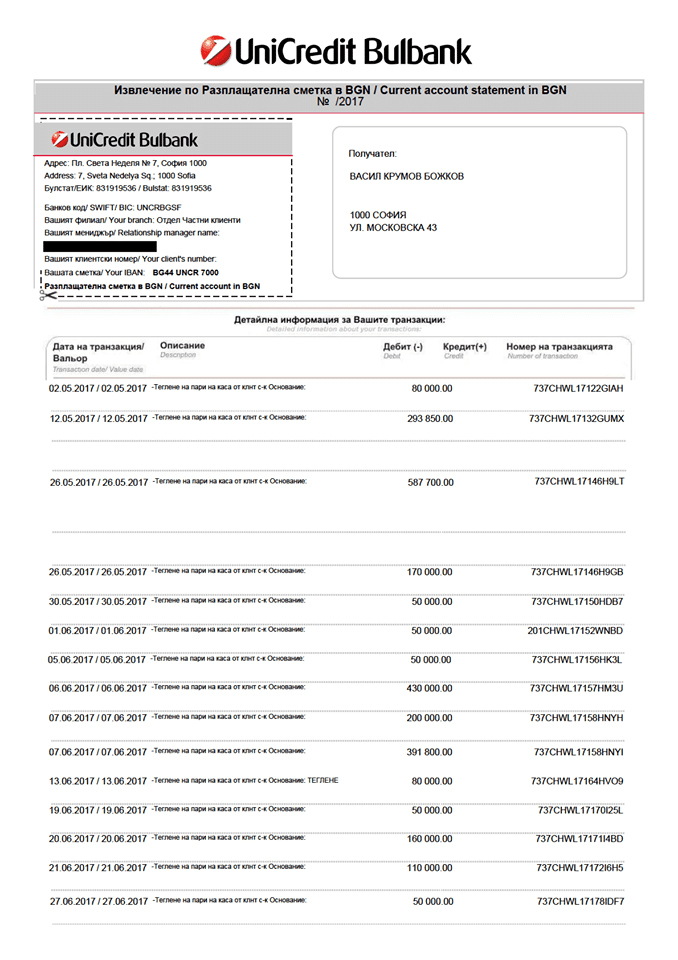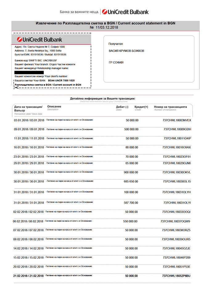 Божков показа снимки, които по негови думи са на извлечения от личната му сметка. На изображенията се виждат изтеглените над 67 милиона лева в брой (след платени данъци):