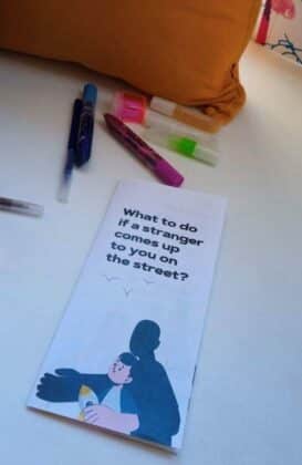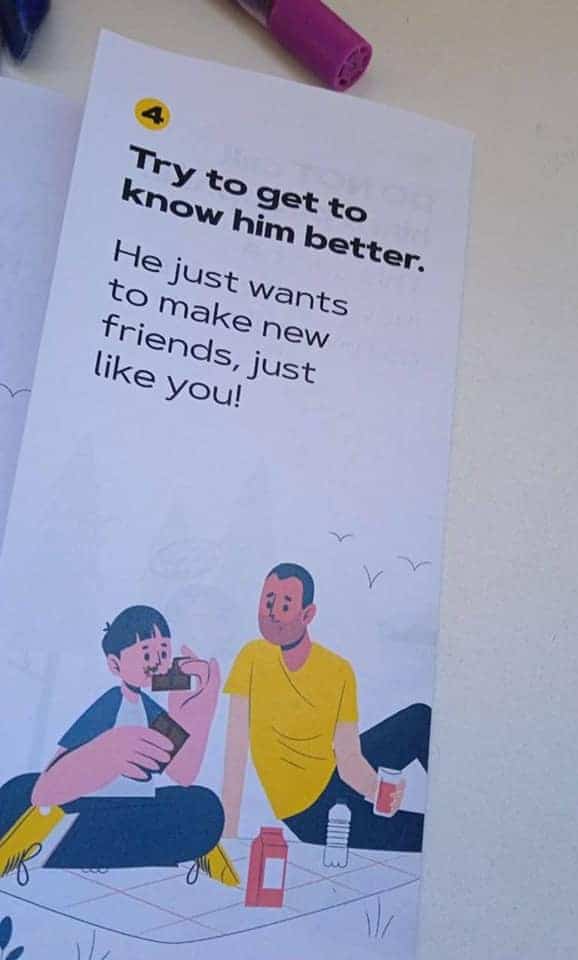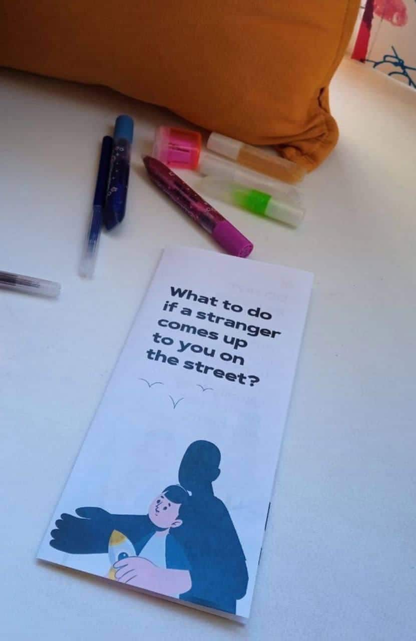 Притеснителната брошура е озаглавена: „Какво да правя, ако непознат дойде при мен на улицата?“ Следващите снимки насърчават децата да се доверяват на непознати и да не ги наричат „педофили“, тъй като думата можело да бъде „обидна“.