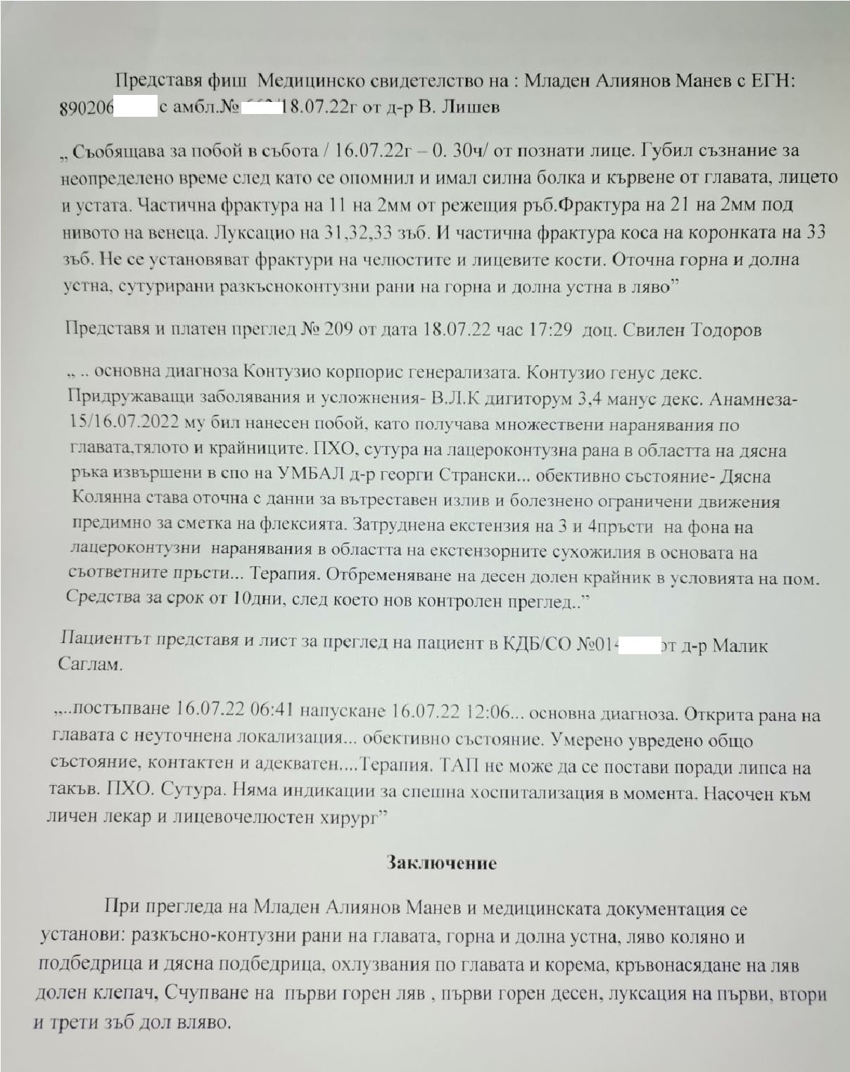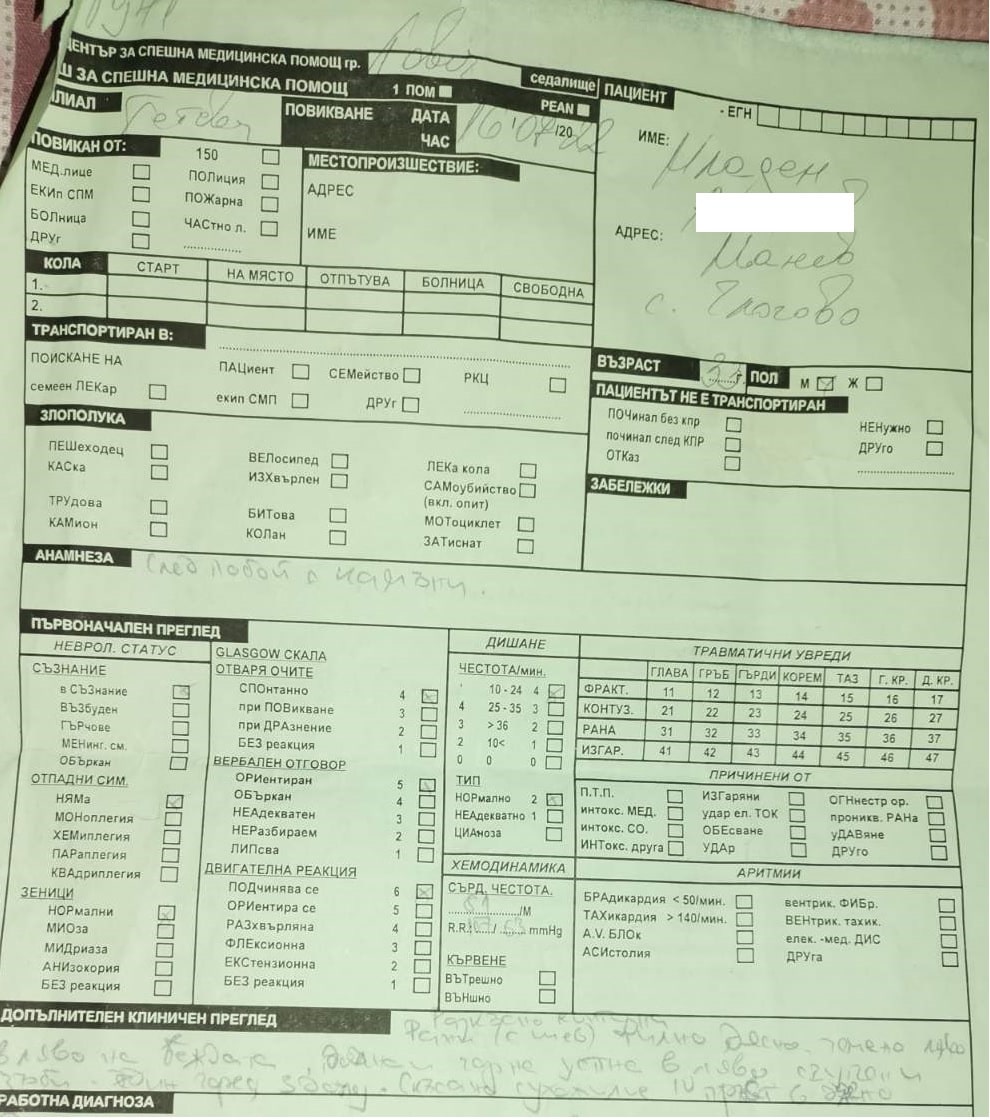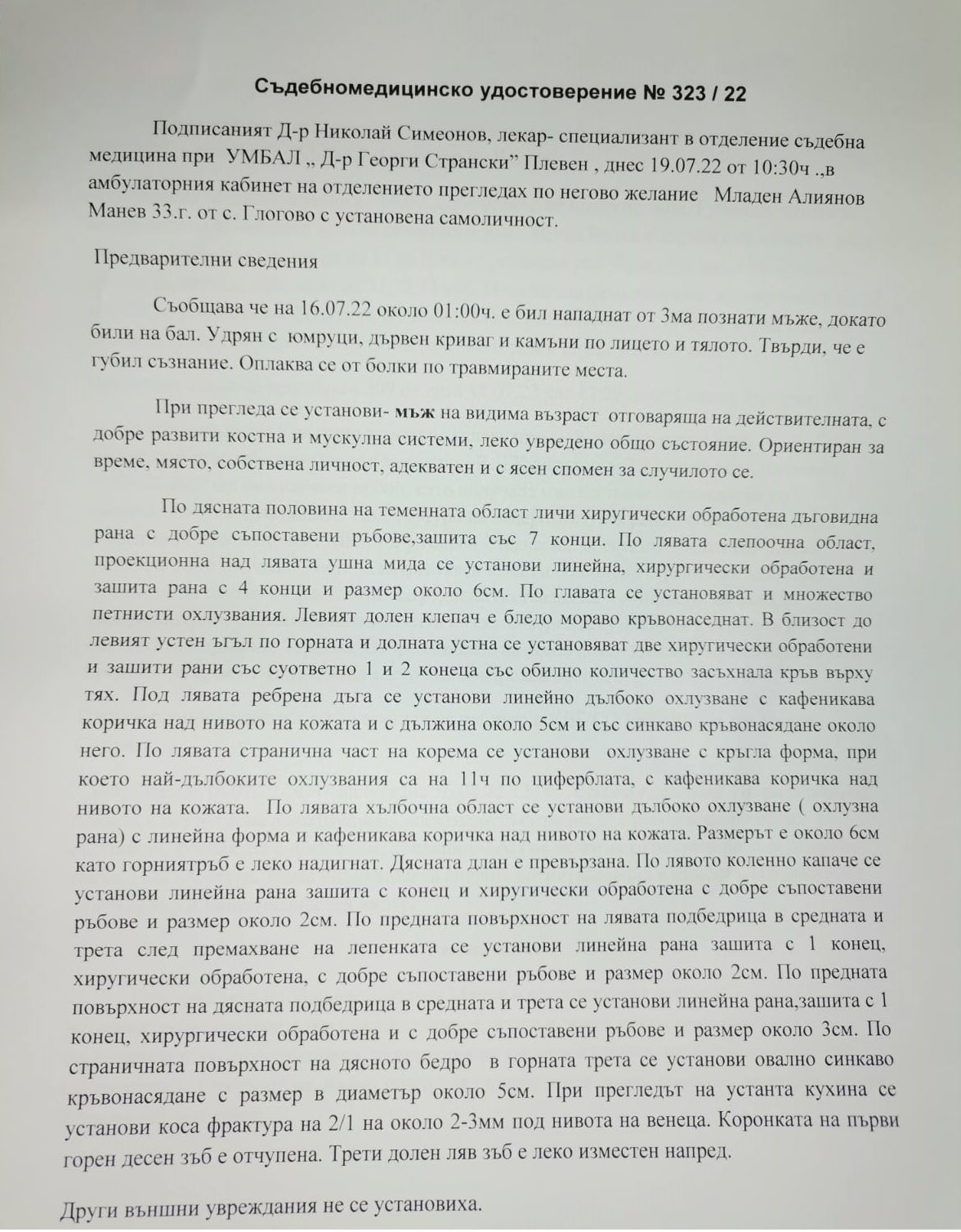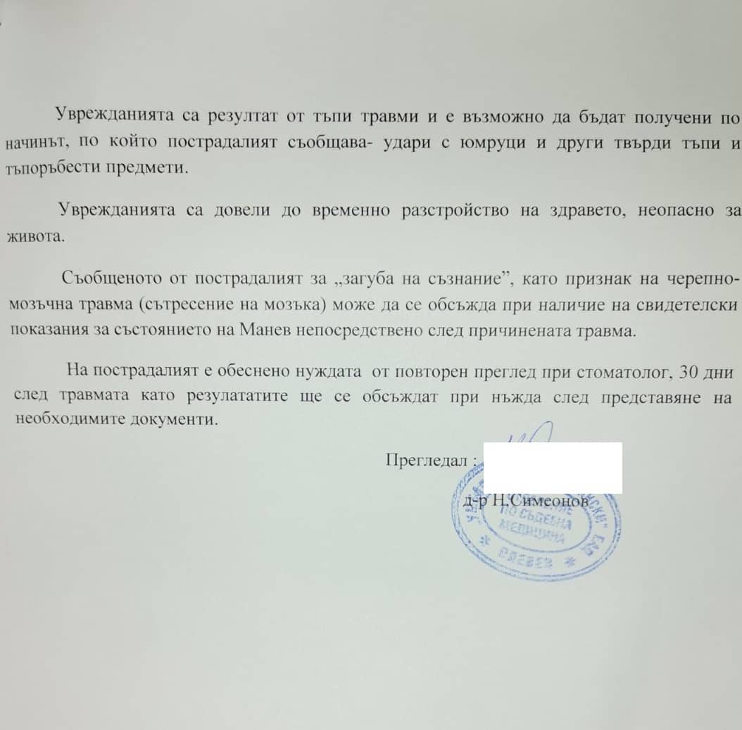 Той е пуснал жалби до Прокуратурата и се надява извършителите на побоя да си получат заслуженото. Според него това е опит за убийство и се надява институциите да си свършат „качествено работата“. Младен предостави на екипи ни документи от побоя, където става ясно, че медицинско лице е установило: разкъсно-контузни рани на главата, горна и долна устна, ляво коляно и подбедрица, охлузвания по главата и корема, кръвонасядане на ляв долен клепач и счупени няколко зъба.