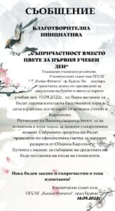 За това призова ученическият съвет към ПГСАГ „Колю Фичето“ в Бургас. Училищното ръководство апелира средствата, предвидени за закупуване на букети да бъдат дарени на бедстващите хора от наводненията в Карловско.