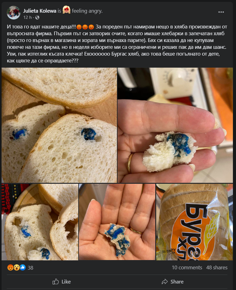 „И това го ядат нашите деца! Бях си казала да не купувам повече на тази фирма, но в неделя изборите ми са ограничени и реших пак да им дам шанс. Уви, пак изтеглих късата клечка! Ехо, „Бургас хляб“, ако това беше погълнато от дете, как щяхте да се оправдаете?“, написа Жулиета Колева във Facebook.