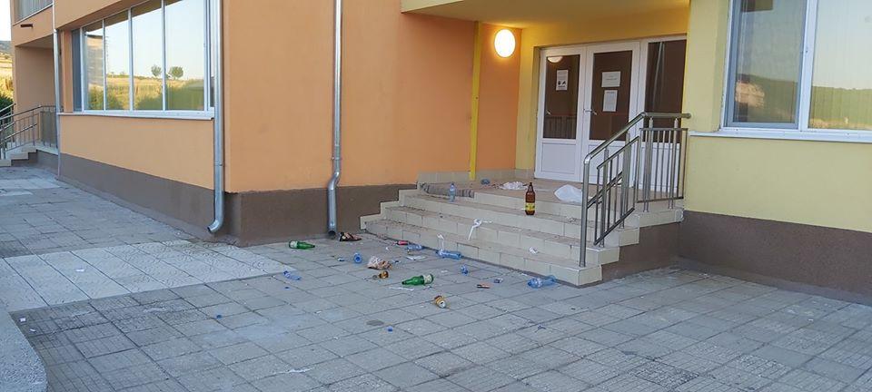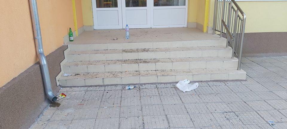 Човекът е заснел снимки, на които се виждат празни бутилки от вода и бира, които са разпилени пред входа на детското заведение. Изхвърлените найлонови торби са другите отпадъци, които замърсяват мястото.