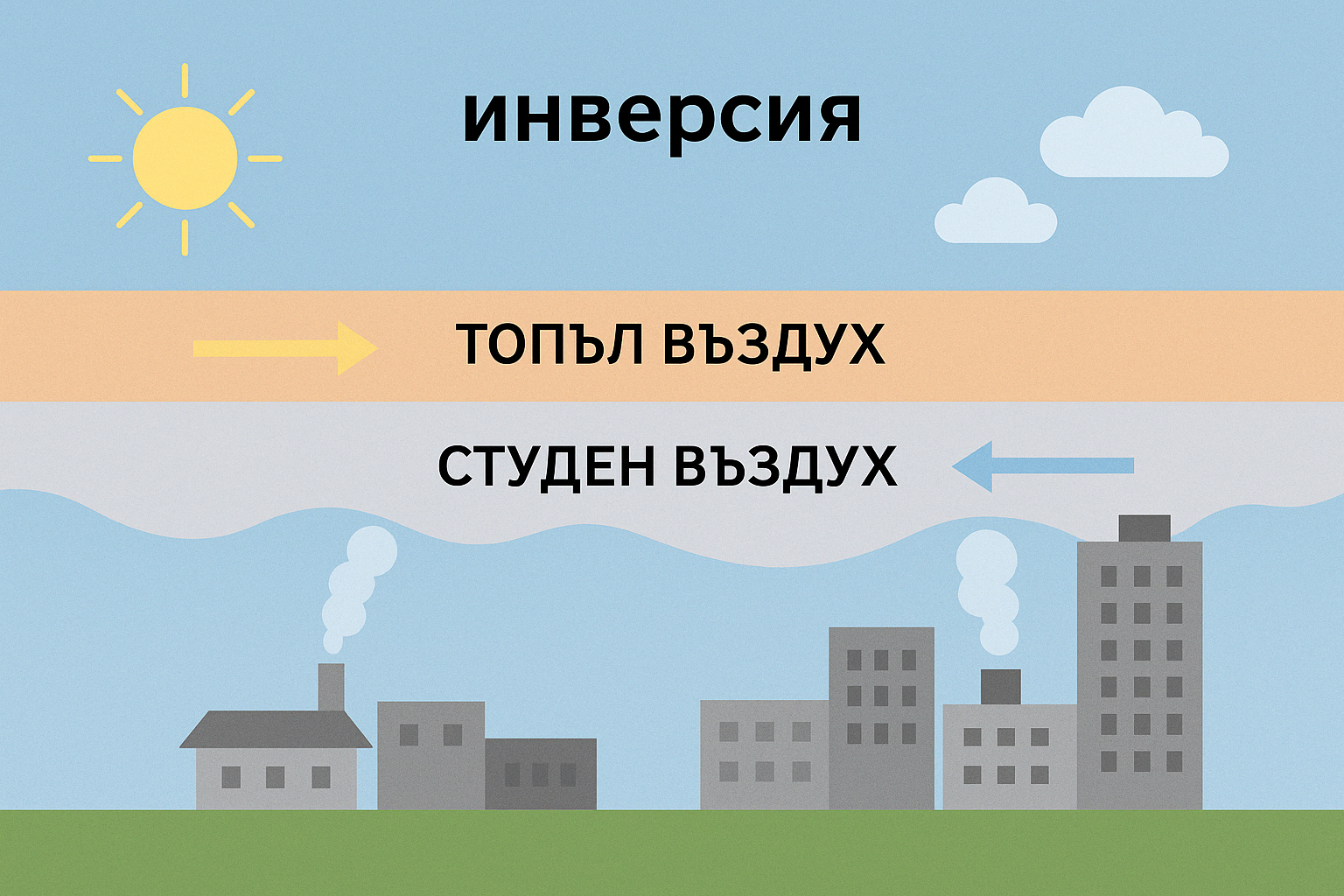- Атмосферно явление: инверсия – При температурна инверсия, студеният въздух остава в ниските слоеве, а топлият го покрива, задържайки изпаренията и замърсителите. Това често води до визуално „покритие“ – мъгла или нещо, което прилича на дим. При температурна инверсия може да се усеща мирис на дим, особено ако има: локални източници на горене – печки на дърва, въглища, камини, дори автомобилни газове; слабо движение на въздуха – димът и замърсителите не се разсейват нагоре, а се задържат ниско, близо до земята; висока влажност, която „задържа“ частиците във въздуха и усилва миризмите.