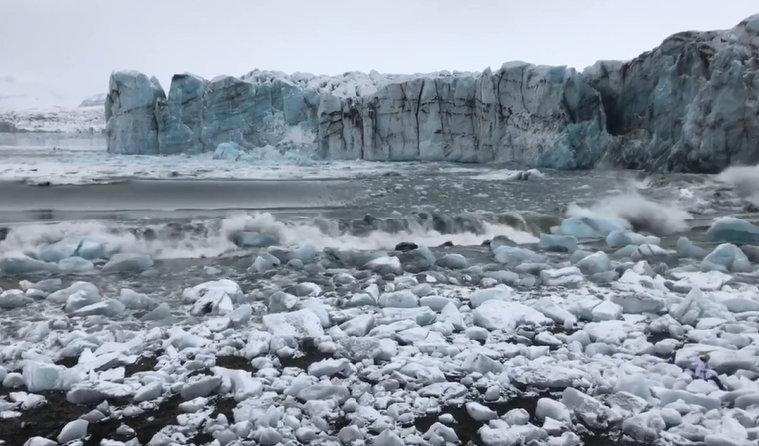 Туристи в Исландия бяха принудени да избягат от настъпващите вълни, причинени от падането на огромно парче лед, част от ледника Брейдамеркурьокул (Breiðamerkurjökull), в морето. Камерата на един от водачите успяла да улови мига на рязкото срутване, пише „RT“.