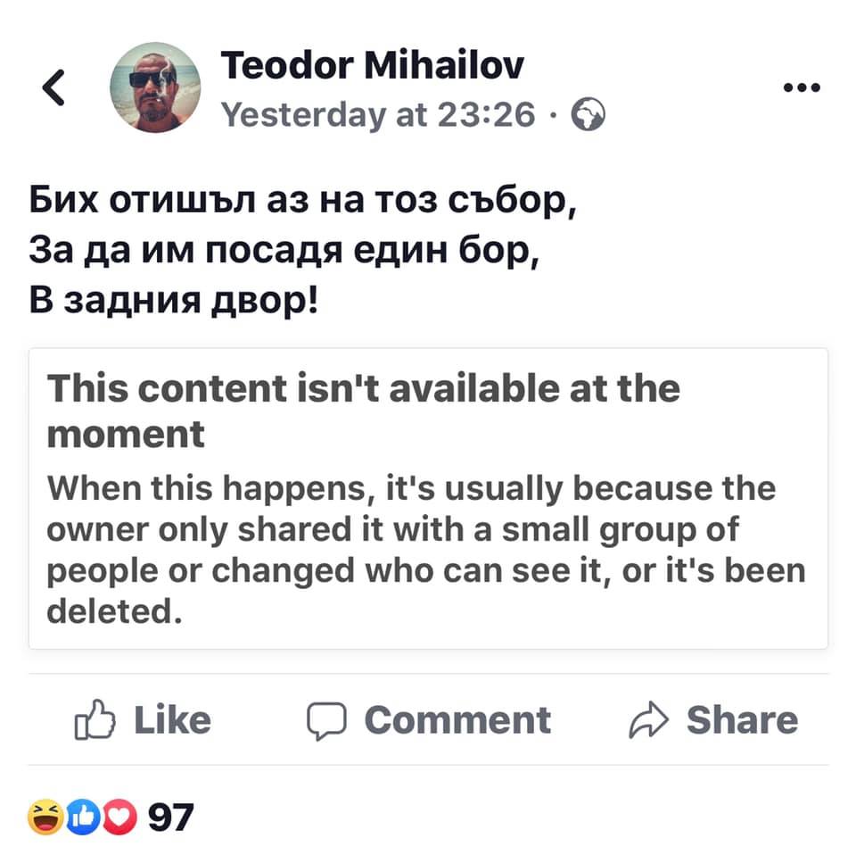 Преди дни публикува статус във Фейсбук, но бива докладван и статусът премахнат.